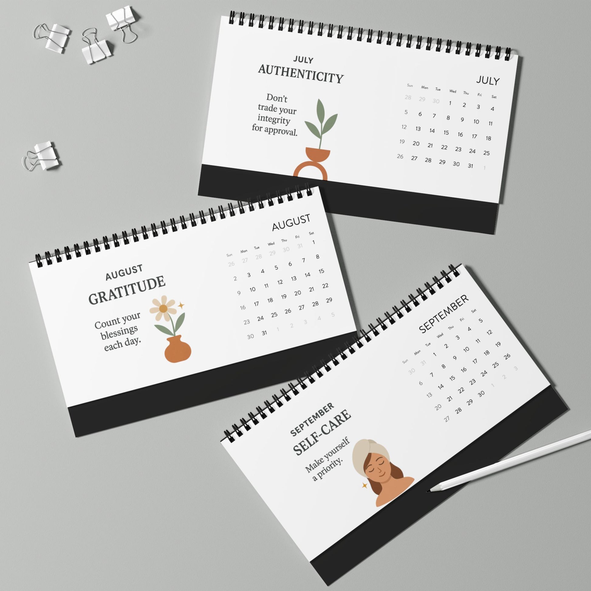Bright, uplifting desktop calendar designed to gently guide your year with intention. The Reset Grid puts a compact month-at-a-glance grid beside a motivational prompt and warm illustration, turning a simple desk accessory into a quiet ritual. Place it on your work table or kitchen counter and let a single word or short practice for each month steer small, steady shifts — balance in January, courage in March, self-care in September. The matte finish and crisp, vivid printing keep the colors calm but cheerful, while the black metal spiral and tent backing give it a clean, sturdy presence that won’t compete with your workspace. Made with thick 250 gsm paper and assembled in the USA, this calendar feels thoughtful in hand and reliable on the desk.