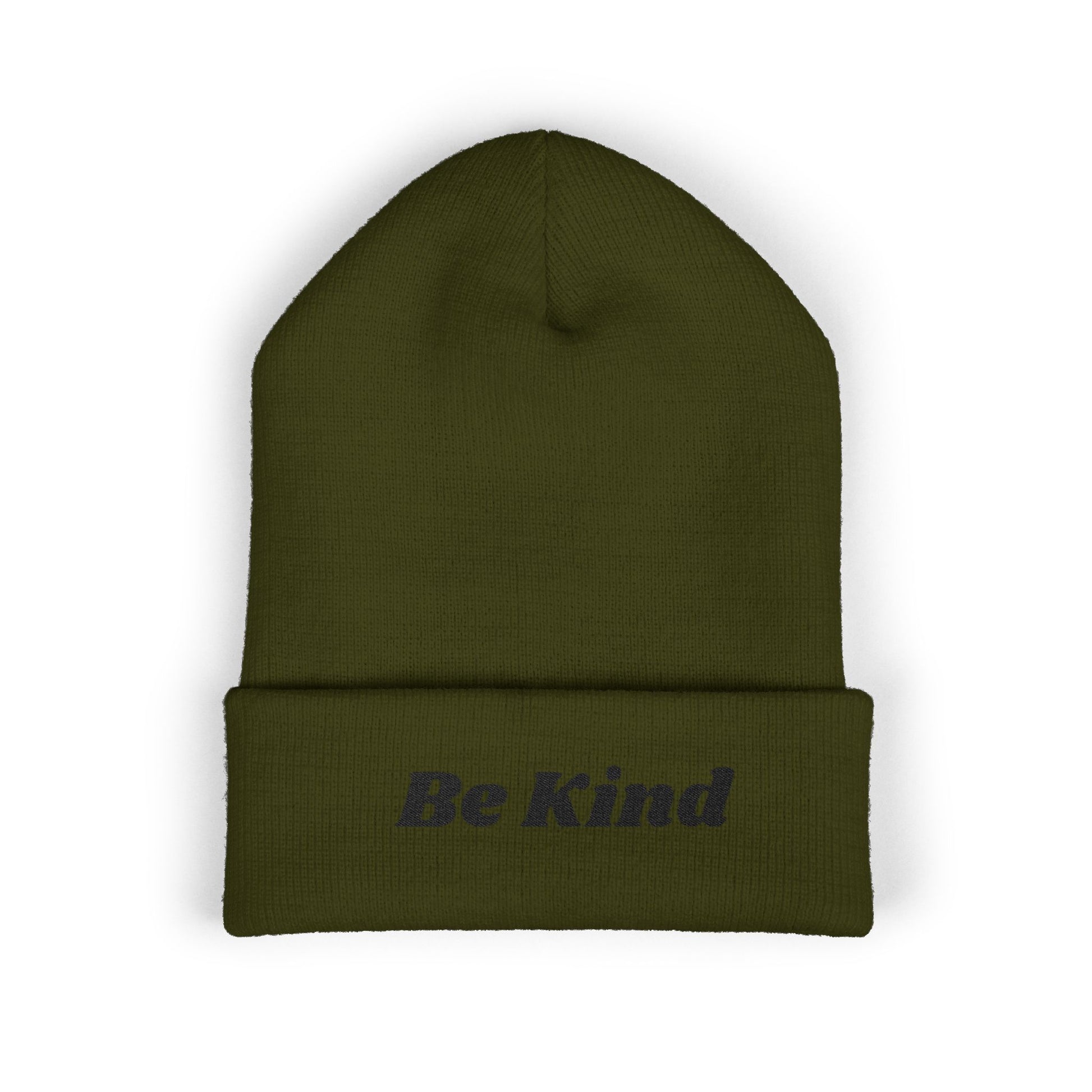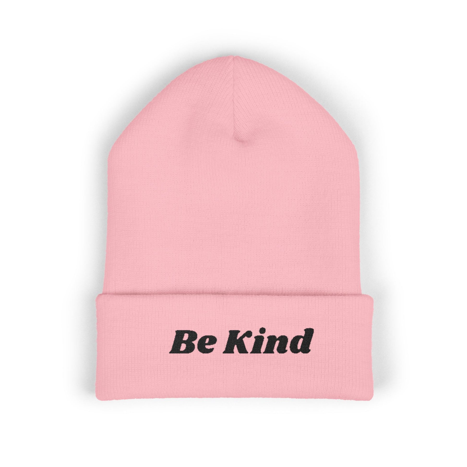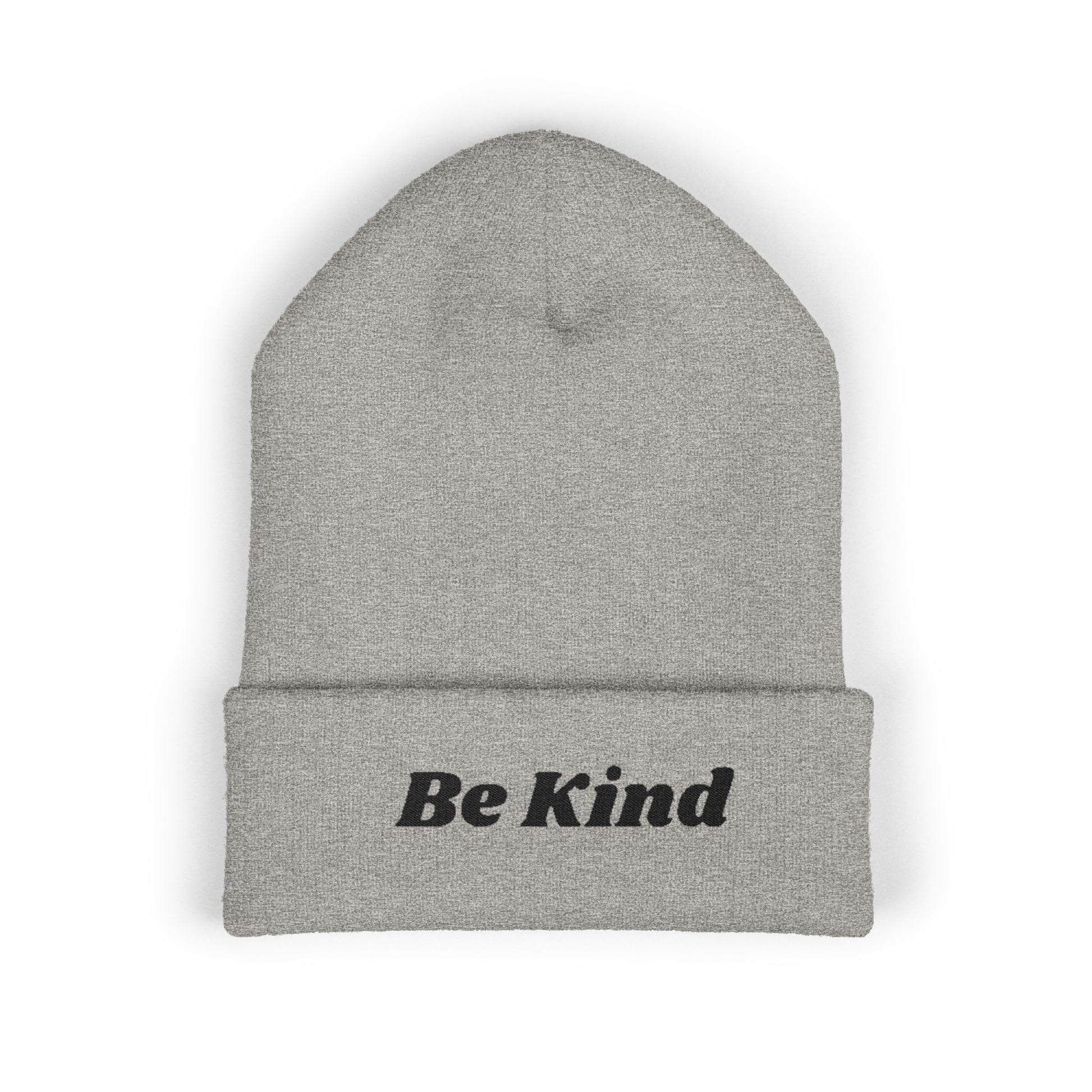 A classic cuffed beanie with the word 'be kind' embroidered on it. This beanie exudes a warm and friendly vibe, perfect for spreading positivity and kindness. Suitable for adults looking for a stylish and meaningful accessory to wear during chilly days or casual outings. Ideal for gift-giving on occasions like birthdays, holidays, or just to show someone you care.