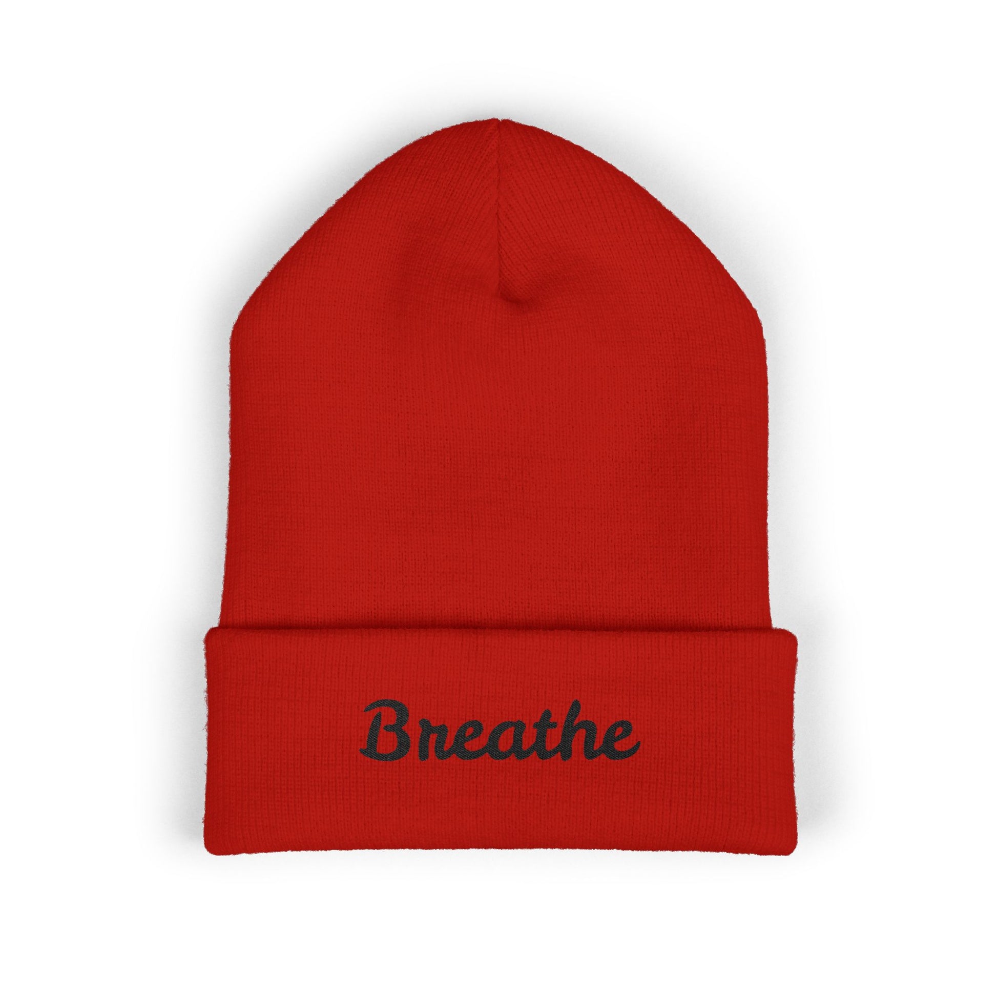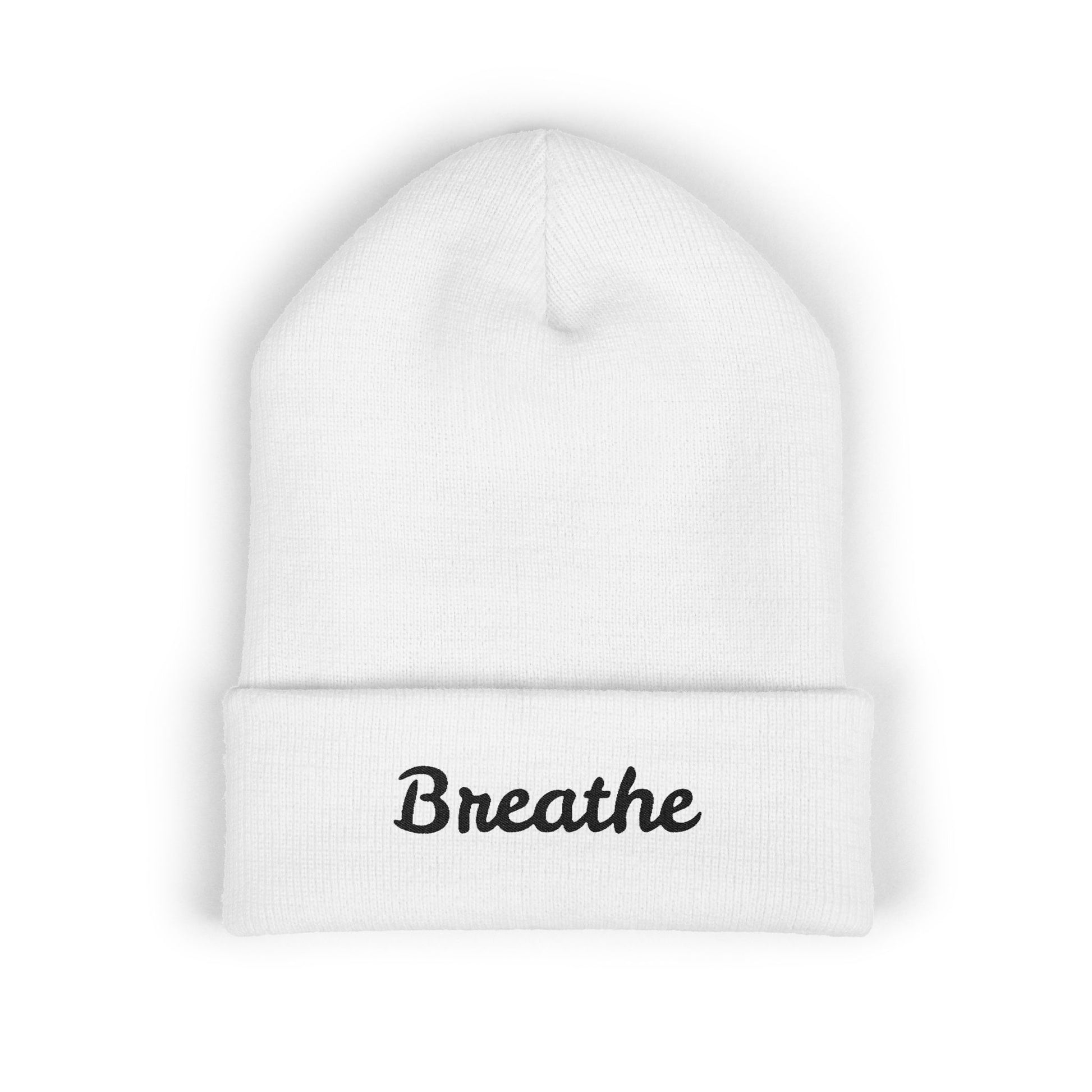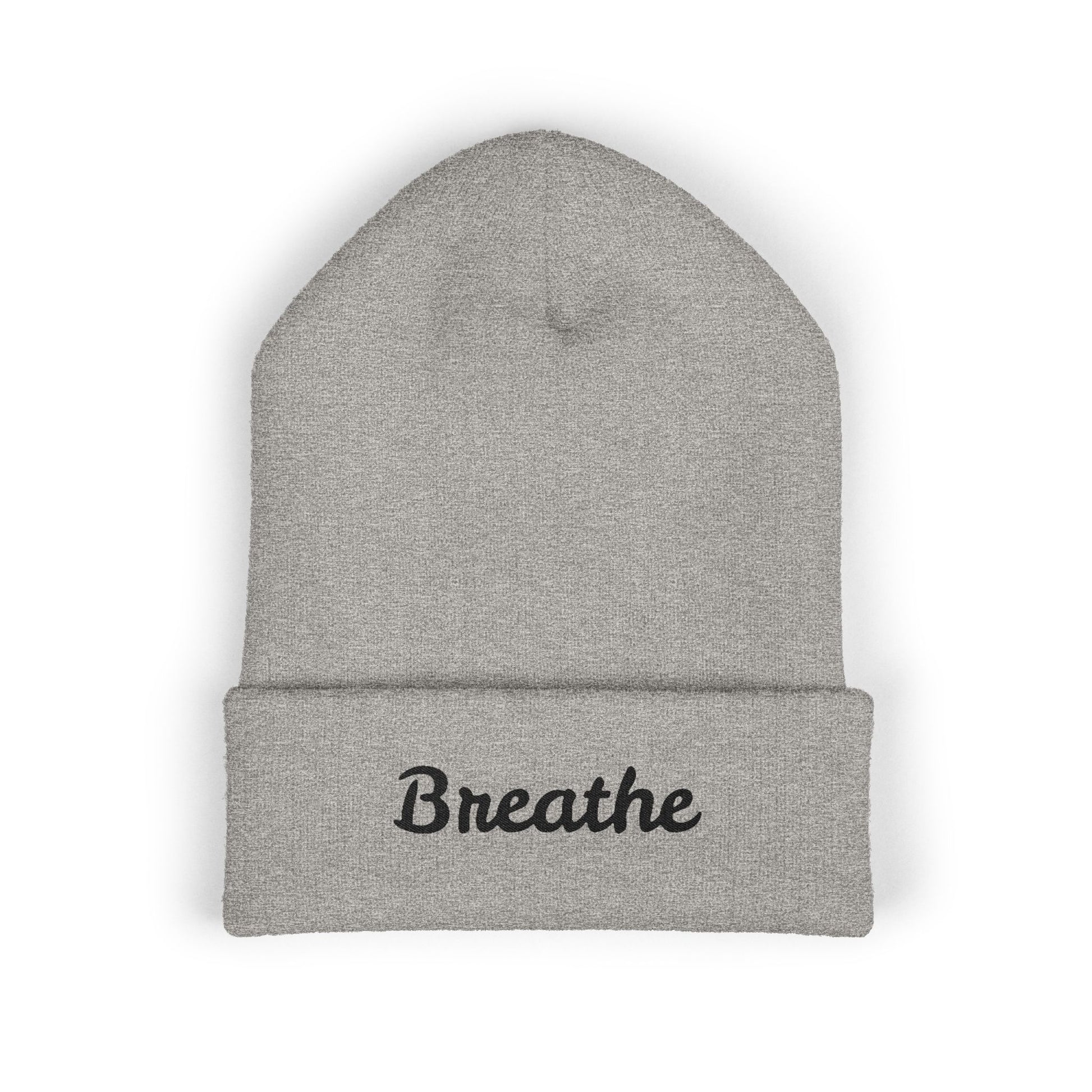 A classic cuffed beanie perfect for everyday wear, featuring the word 'breathe' embroidered on the front. This beanie exudes a calming and relaxed vibe, fitting seamlessly into the buyer's daily life. Ideal for adults looking for a stylish yet comfortable accessory for any season.