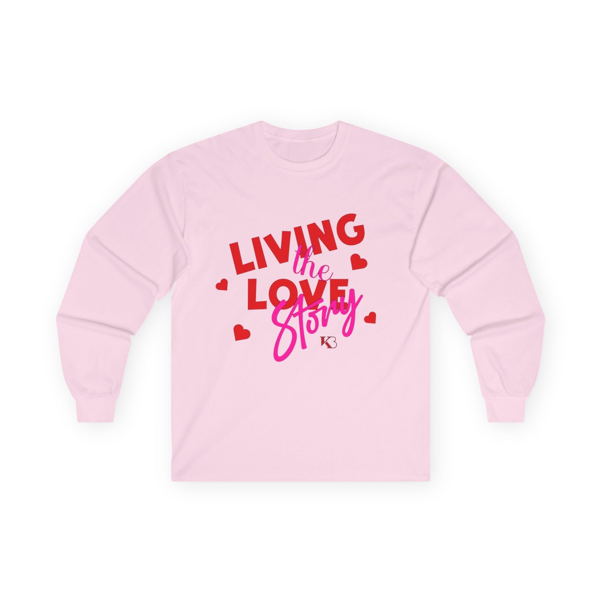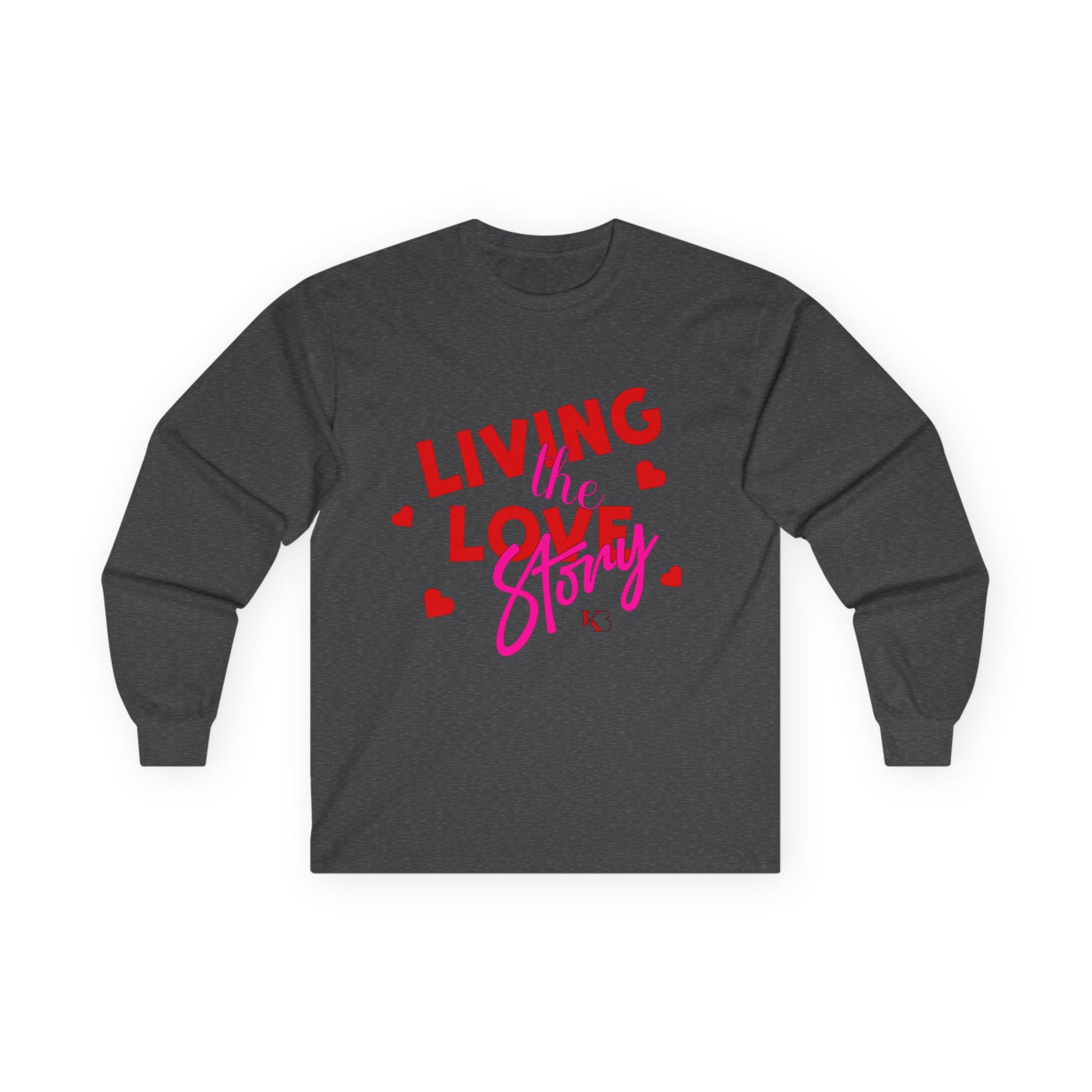 Long Sleeve Tee — "Living the Love Story" Heart Graphic Valentine's Shirt